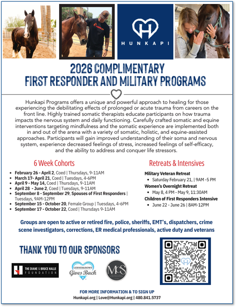The First Responder Program began in January 2019 and provides equine Somatic Experiencing to first responders looking for tools to reduce their stress. Hunkapi Programs’ model includes focusing on the psycho education of the somatic effect of prolonged and consistent exposure to traumatic events and implementation of mindfulness and somatic experience into the therapeutic processes both in and out of the arena with our four-legged healers. First Responders will exit with improved understanding of their soma and nervous system, decreased feelings of stress and increased feelings of self efficacy to handle work and life stressors. Hunkapi also is committed to decreasing the shame and stigma around seeking help and services through education and normalizing the stress response inherent to being a front line worker. Current Group Programming: Please register below. This program is open to all First Responders. If you any questions about this program, please contact our office at love@hunkapi.org or 480.393.0870. We will be in touch once you register with additional information and release forms.*The First Responder Group is open to fire, police, sheriffs, EMTs, dispatchers, crime scene investigators, corrections, military and veteran’s. Future dates will be announced on this page and our social media channels.